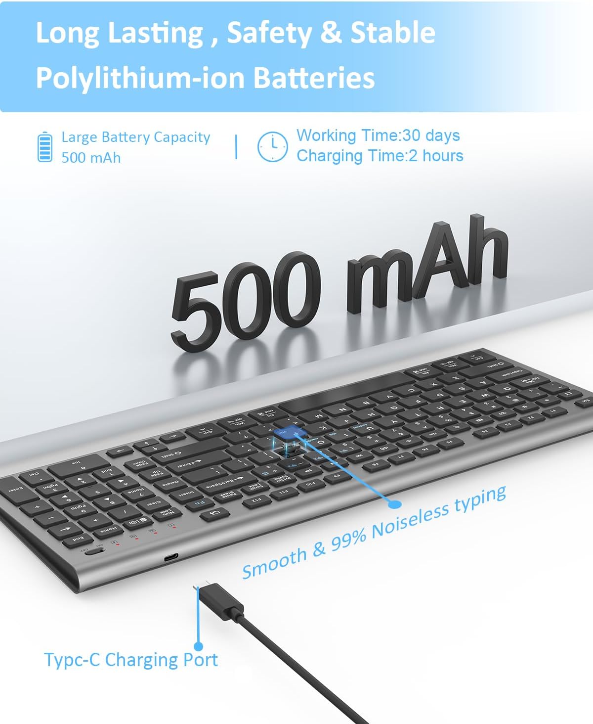 【USB-C Rechargeable】 Say goodbye to battery replacements. Under normal use, a quick charge of approximately 1.7 hours every 2 months is all it takes to enjoy a reliable wireless typing experience all day long. It’s the smart and sustainable choice.