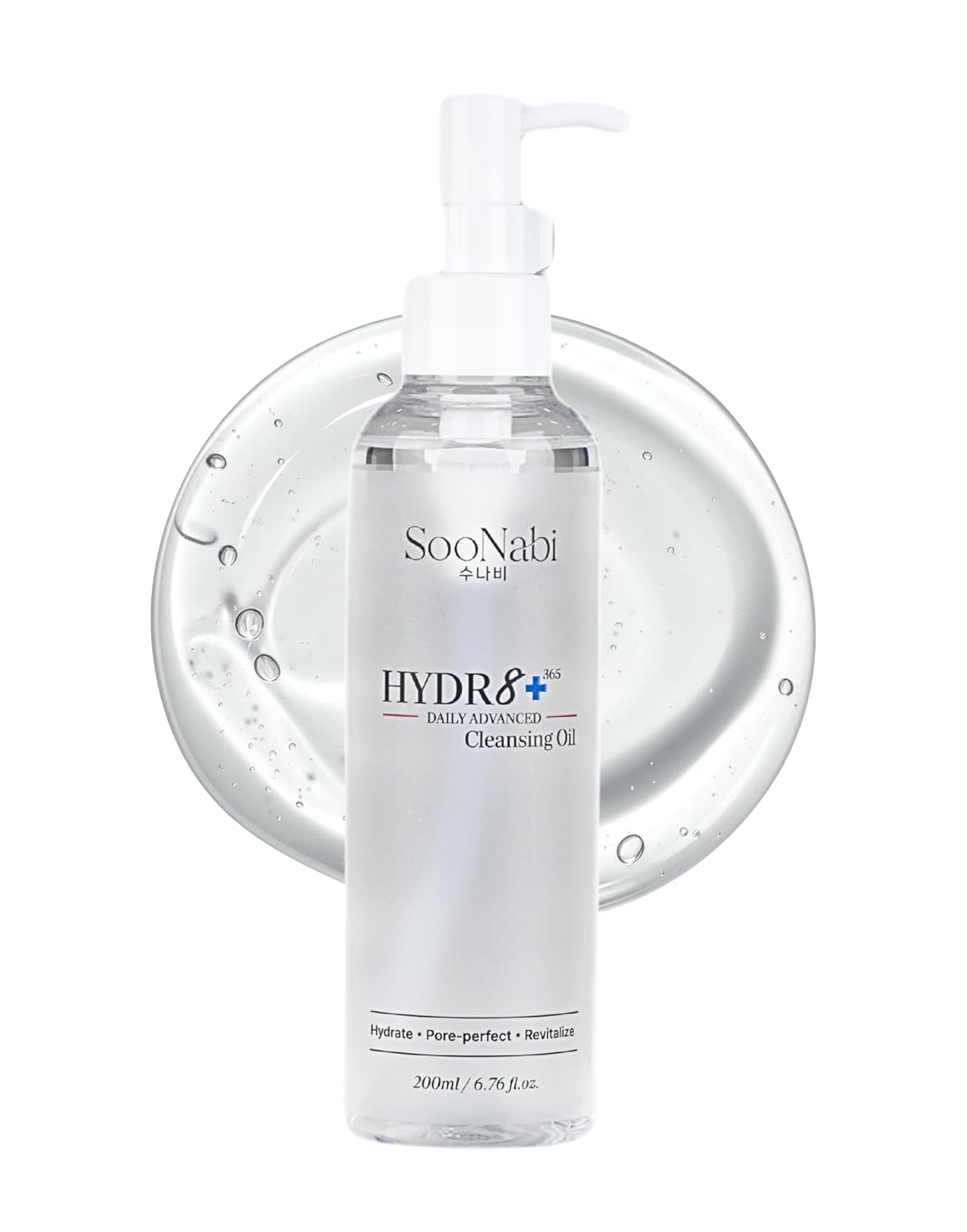 SooNabi HYDR8+ 365 Daily Advanced Cleansing Oil delivers a smooth, effortless first cleanse that melts away makeup, sunscreen, and daily buildup. Its lightweight texture glides across the skin and rinses clean without heaviness. Powered by jojoba oil, NB‑P complex, beta glucan, tea tree, and botanical extracts, this formula helps support hydration and leaves skin feeling comfortable and refreshed. Whether you double‑cleanse or prefer a single‑step routine, HYDR8+ 365 creates a clean, balanced canvas for the rest of your skincare routine. Vegan, gentle, and suitable for all skin types. This is the cleansing oil you’ll reach for every day.